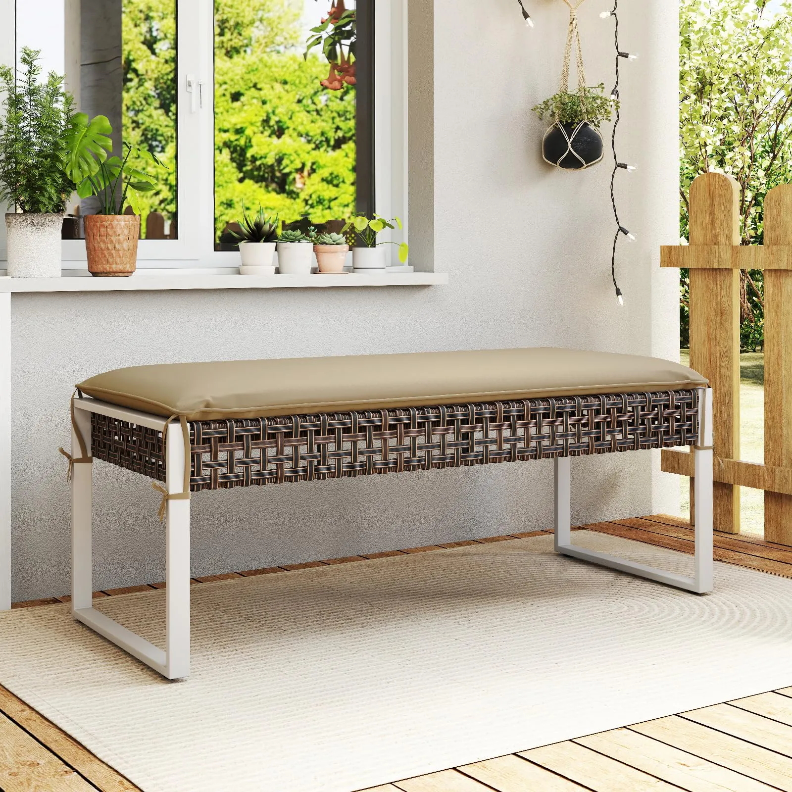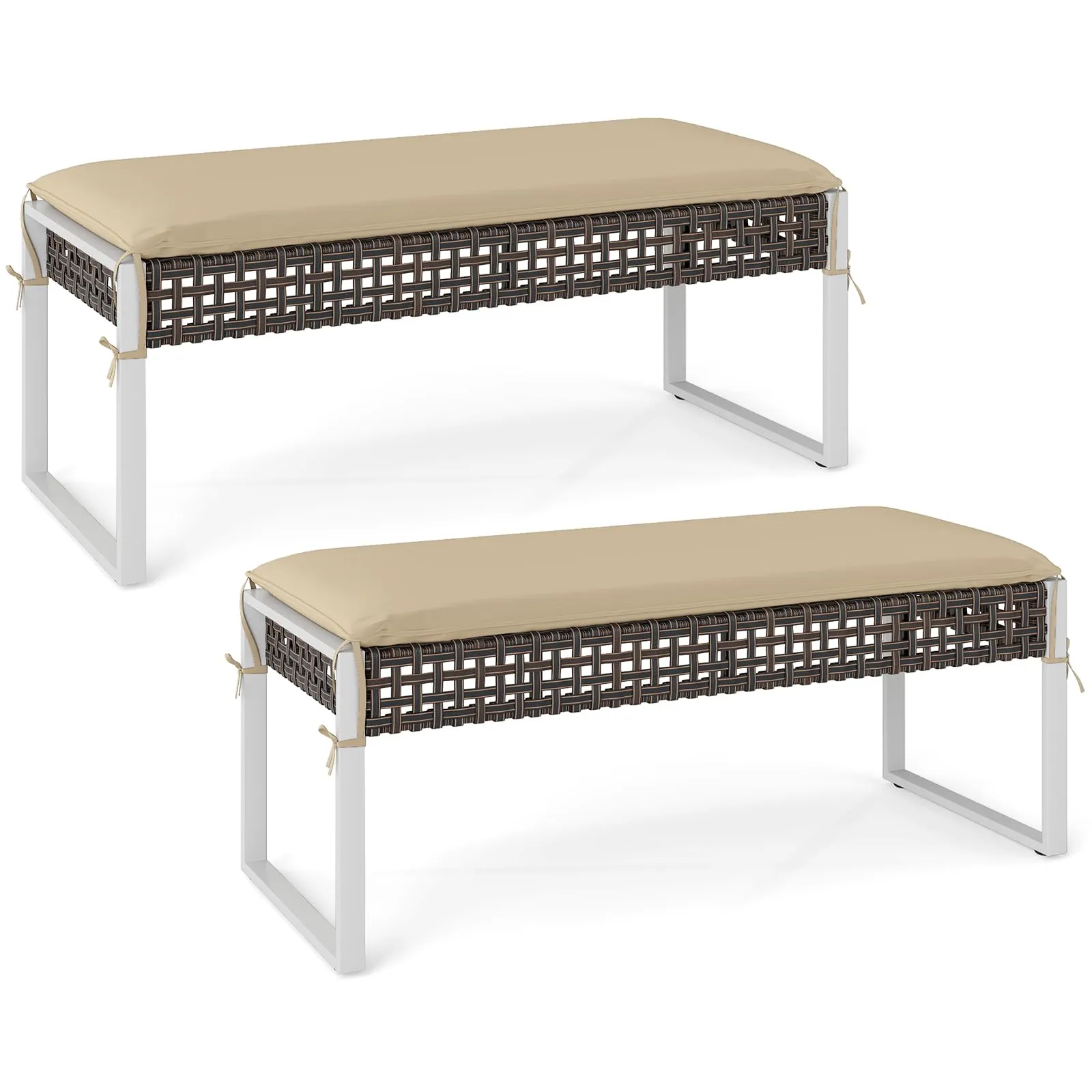 Tangkula Outdoor Stackable Bench, All-Weather PE Wicker Loveseat with Acacia Wood Armrests