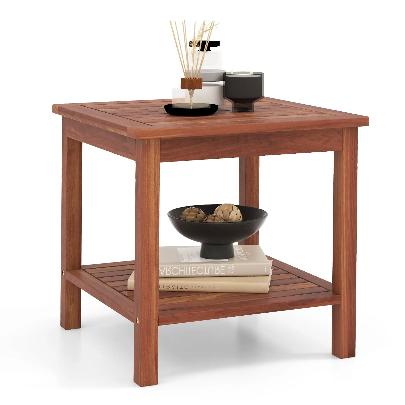 This 2-tier wood side table will be an awesome addition for your outdoor relaxation.Crafted from high-grade acacia wood, the main frame of the side table offers superior stability and longevity. It’s not only resistant to abrasion but also requires minimal maintenance due to its burr-free surface. And with reinforced crossbars, the overall stability of the table is greatly enhanced. Plus, the 2-tier design provides ample storage space for drinks, snacks, magazines, and phones. And the natural color and appealing wood surface make it a striking piece suitable for various occasions. Embrace functionality, style, and exceptional longevity with the robust acacia wood frame side table.