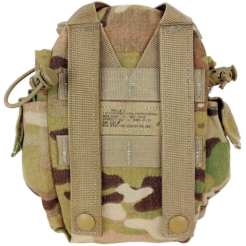 The MOLLE II Multicam canteen pouch will accommodate a 1 quart (0.95 litres) US canteen, water purification tablets and matches or other fire starters. Use one to carry your canteen or as a general purpose pouch. Dual MOLLE straps allow the pouch to be attached to belts, combat vests and packs.