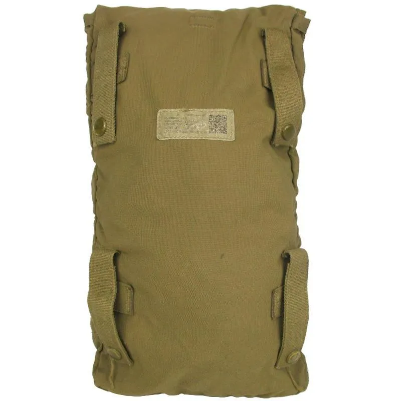 The pouch is secured to a MOLLE surface with 4 PALS tabs that have snap domes. To add your hydration bladder (not included) there is a plastic clip and adjustable strap you simply open at the top of the pouch. Inside there is a cord loop you can feed the drinking tube through so the bladder doesn’t slouch. If you happen to not secure the lid on your bladder correctly or get a leak, the pouch has a large drain hole to release the build up of water. Made from a hard wearing codura finished in coyote brown, these have plenty of life left in them and will protect your hydration bladder well.